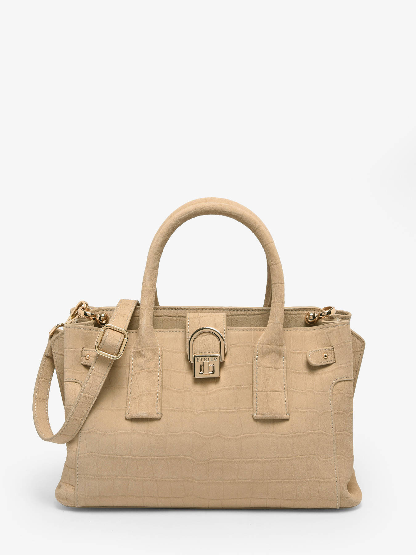 Le sac porté main EQUESTRE CROCO d'Etrier, en format compact et raffiné, est réalisé en cuir de vachette velours imprimé crocodile. Ce mélange audacieux de textures offre une allure sophistiquée et un charme sauvage, emblématique de la ligne Equestre. Il se ferme par une fermeture zippée, un rabat et un fermoir, assurant élégance et sécurité. La hauteur de la anse est de 12 cm, et le sac est équipé d'une bandoulière réglable et amovible pour un porté polyvalent à la main ou en bandoulière. À l'intérieur, deux compartiments, accompagnés de deux poches simples et une poche zippée, facilitent l'organisation de vos essentiels. Les finitions dorées apportent une touche raffinée à ce modèle compact. Ce sac existe également en format M, pour plus d'espace selon vos besoins.